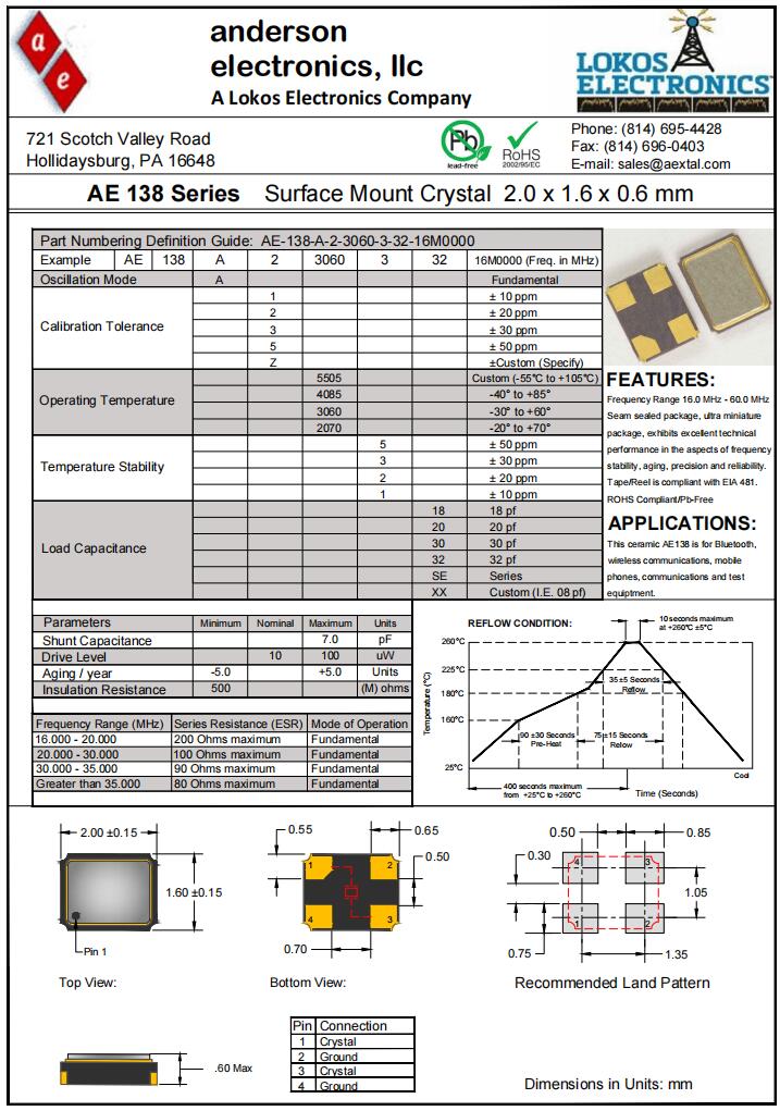 Anderson晶振|AE-138-A-2-5505-3-32-16M0000|2016超小型晶振,歐美進口晶振,Anderson晶振,AE138貼片晶振,無源晶振,AE-138-A-2-5505-3-32-16M0000晶振,石英晶體諧振器,四腳貼片晶振,2016mm晶振,SMD晶體,頻率16MHz,負載32pF,工作溫度-55~105°C,頻率容差20pm,超小型晶振,耐高溫晶振,無鉛環(huán)保晶振,無線通信晶振,測試與測量設(shè)備晶振,移動電話晶振,工業(yè)控制系統(tǒng)晶振.