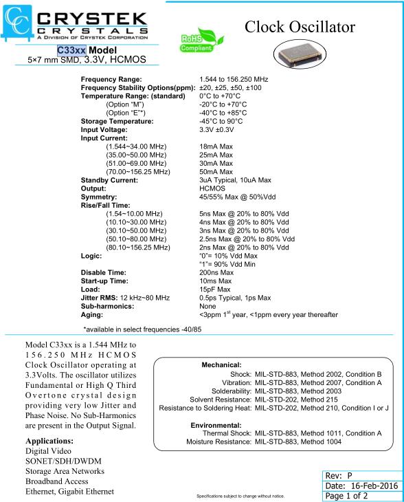 更多>>C33xx系列時(shí)鐘振蕩器,Crystek歐美晶體,C3392-20.000MHz晶振