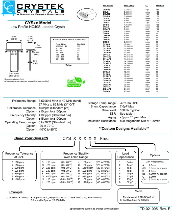 Frequency Range: 8.000 MHz to 50.000 MHz (Fund) 40.000 MHz to 100.000 MHz (3rdOT) |