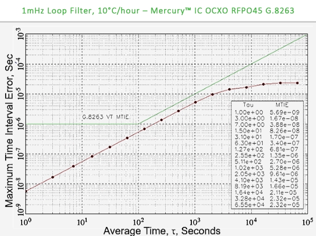 對(duì)于基于數(shù)據(jù)包的同步,振蕩器的中期穩(wěn)定性要求是關(guān)鍵。傳統(tǒng)上,傳輸設(shè)備過(guò)去需要 Stratum 3 級(jí)穩(wěn)定性,以支持系統(tǒng)中 0.1Hz 至 10Hz 的環(huán)路帶寬。基于 Packet 的 clocks 具有低得多的帶寬,為了滿足整個(gè)工作溫度范圍內(nèi)的 wander 生成指標(biāo),需要更穩(wěn)定的振蕩器。Rakon 與基于數(shù)據(jù)包的算法供應(yīng)商合作,測(cè)試振蕩器的各種環(huán)路帶寬,并對(duì)其進(jìn)行調(diào)整以滿足標(biāo)準(zhǔn)要求。下面顯示了使用 Rakon 振蕩器在 1mHz 下完成的 MTIE 測(cè)試,該振蕩器符合標(biāo)準(zhǔn)掩碼。