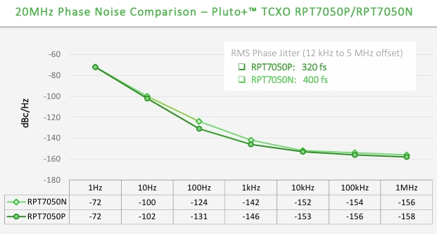 Rakon 與基帶 SoC 解決方案供應(yīng)商和無(wú)線電解決方案供應(yīng)商合作,以確保輕松滿足解決方案最佳性能的相位噪聲要求。以下是 Rakon 的 RPT 系列 TCXO 的典型相位噪聲圖,采用專利的 Pluto+ ™ 補(bǔ)償技術(shù)。