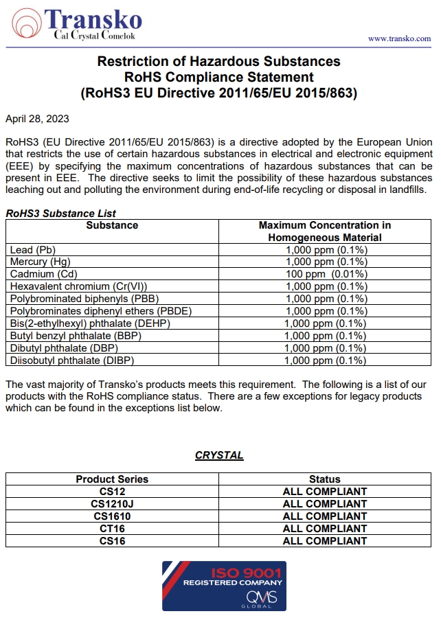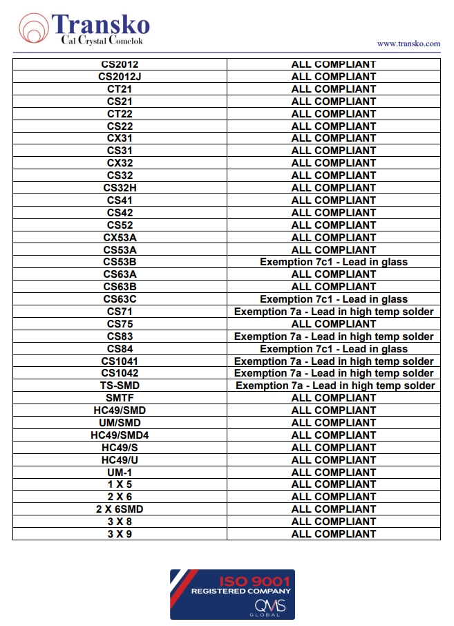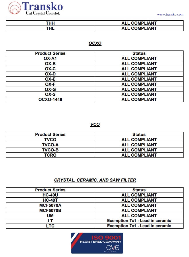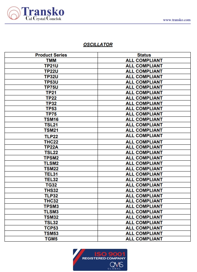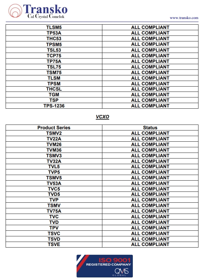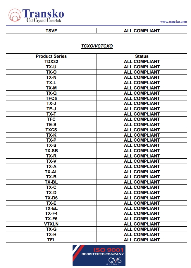 Transko Electronics, Inc.是一家領(lǐng)先的ISO 9001認(rèn)證的電子行業(yè)頻率控制產(chǎn)品制造商,實施質(zhì)量體系已滿足國家和國際質(zhì)量體系的要求的需要。一直以來,Transko晶振的質(zhì)量體系都持續(xù)符合ISO 9001的要求并不斷提高質(zhì)量管理體系的有效性。提供優(yōu)質(zhì)的產(chǎn)品和服務(wù)是Transko Electronics, Inc.的既定政策,始終如一地滿足客戶的需求,實現(xiàn)了領(lǐng)先同行的高質(zhì)量環(huán)保生產(chǎn)標(biāo)準(zhǔn)。