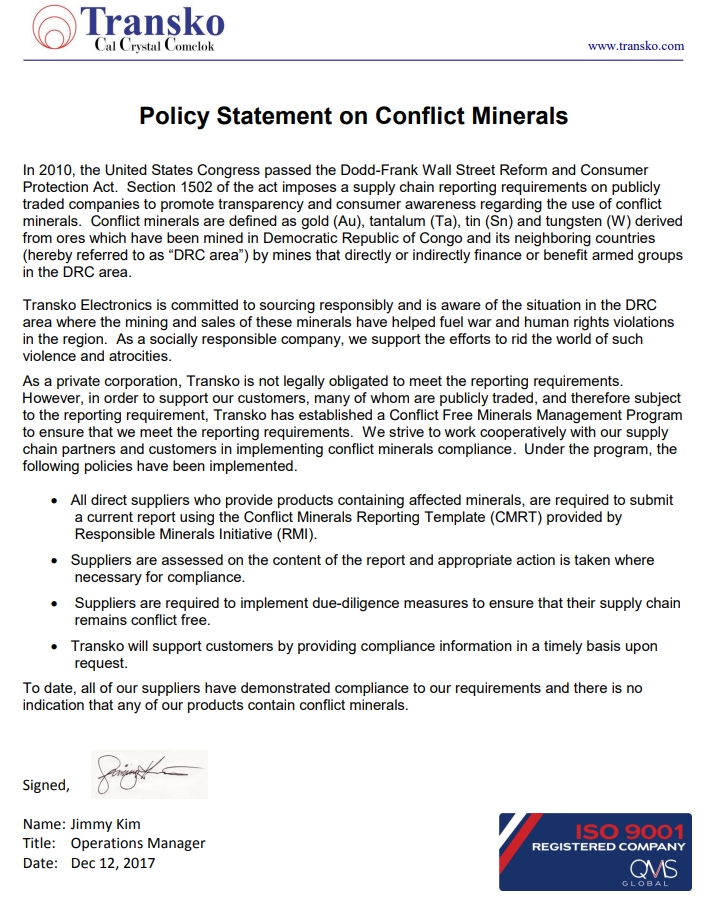 作為一家私營公司,Transko在法律上沒有義務(wù)滿足報告要求。 然而,為了支持我們的客戶,他們中的許多人是公開交易的,因此受到根據(jù)報告要求,Transko制定了無沖突礦產(chǎn)管理計劃來確保我們符合報告要求。我們努力與供應(yīng)商合作實施沖突礦物法規(guī)的供應(yīng)鏈合作伙伴和客戶。根據(jù)該計劃已經(jīng)實施了以下政策:
