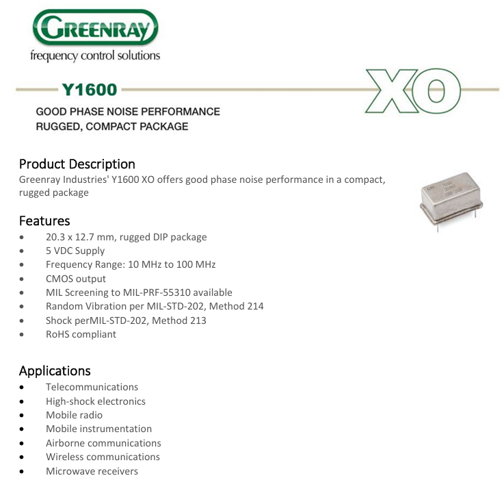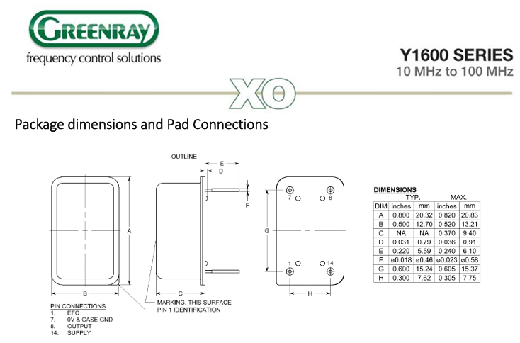 格林雷晶振Y1600 XO具有諸多令人矚目的特點.它采用20.3x12.7毫米堅固的DIP封裝,這種封裝不僅能有效保護內部精密元件,還能適應各種復雜的工作環(huán)境.5V直流電源的設計,既保證了穩(wěn)定的供電,又符合大多數電子設備的電源標準.其頻率范圍覆蓋10MHz至100MHz,能滿足不同設備對頻率的多樣化需求.