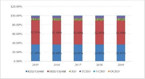 無源晶振產(chǎn)銷量在石英晶振市場中占較大份額.根據(jù)CS&A數(shù)據(jù),2018年全球利用石英晶體制成的頻率元件產(chǎn)值為33億美元,其中無源產(chǎn)品產(chǎn)值為18億美元,占比為55.3%.石英晶體頻率元件年銷量180億顆,其中無源產(chǎn)品銷量為164.45億顆,占比為89.3%.