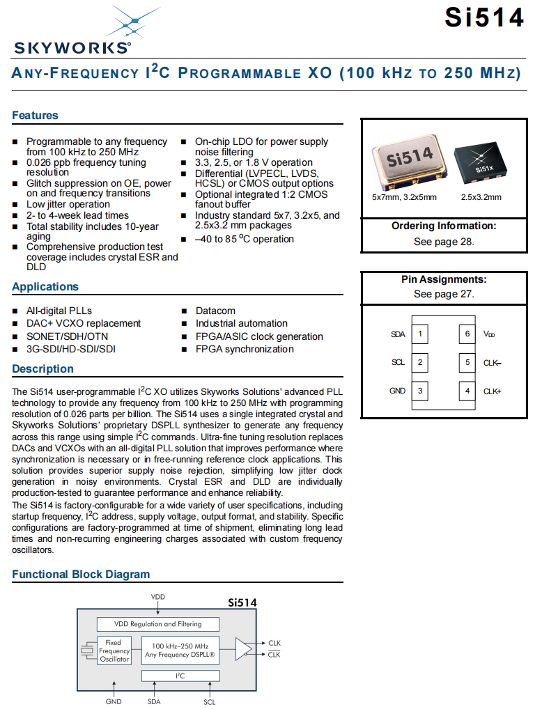 | 530BB125M000DG | Skyworks | Si530 | XO | 125 MHz | LVDS | 3.3V | ±20ppm |