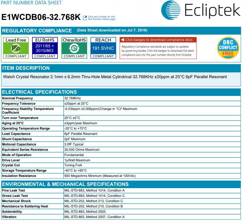 日蝕晶振E1WC,E1WCDB06-32.768K石英插件晶振, Ecliptek晶振,歐美晶振,石英晶體,音叉晶體,無源晶振,圓柱晶振,32.768K晶振型號E1WC,E1WCDB06-32.768K是一款圓柱型金屬面的插件晶振,尺寸為2060mm,頻率32.768KHZ,精度20ppm,負載電容10pF,工作溫度-20~+70°C.具備高性能的特點,比較適合用于兒童玩具,錄音筆等領域.