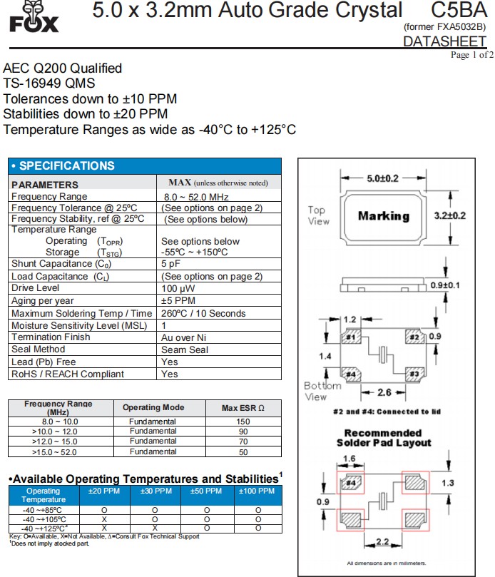 | FC5BACBEI26.0-T1 | Fox 晶振 | C5BA | 26 MHz | ±50ppm | ±30ppm | 10pF | -40°C ~ 125°C |