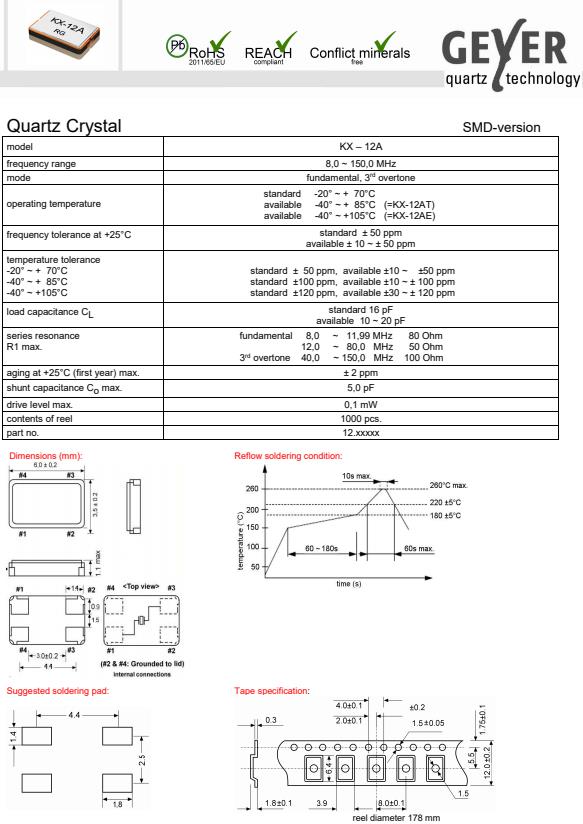 GEYER晶振,KX-12A高品質(zhì)晶振,SMD無源晶振,貼片晶振本身體積小,超薄型石英晶體振蕩器,特別適用于有目前高速發(fā)展的高端電子數(shù)碼產(chǎn)品,因?yàn)?strong>晶振本身小型化需求的市場領(lǐng)域,小型,薄型是對應(yīng)陶瓷振蕩器(偏差大)和普通的石英晶體振蕩器(偏差小)的中間領(lǐng)域的一種性價比較出色的產(chǎn)品.產(chǎn)品廣泛用于筆記本電腦,無線電話,衛(wèi)星導(dǎo)航SSD,USB,Blu-ray等用途,符合無鉛焊接的高溫回流焊曲線特性.
