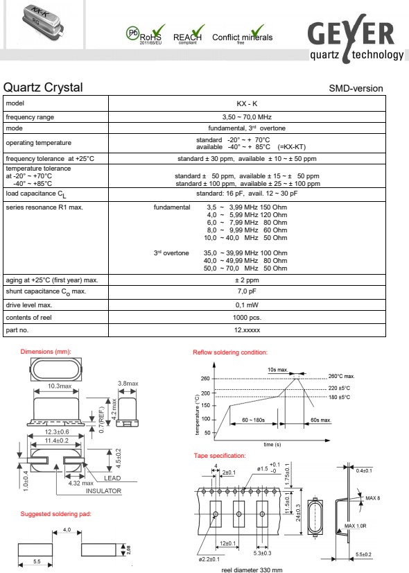 | frequency tolerance at +25°C | standard ± 30 ppm, available ± 10 ~ ± 50 ppm |