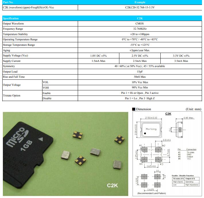 | C2K (waveform) (ppm)-Freq(KHz)-OL-Vcc | C2KC20-32.768-15-3.3V |