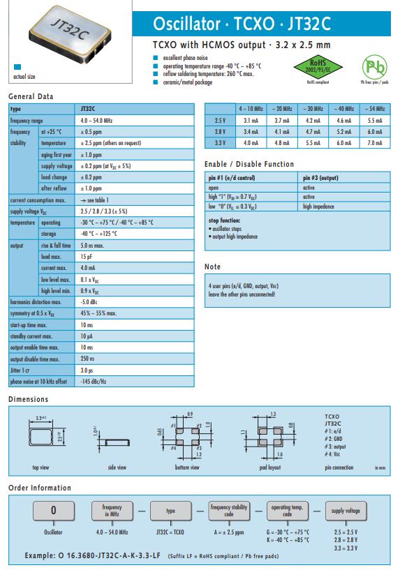 JUACH晶振,JT32C晶振,3225溫補(bǔ)晶振體積的溫補(bǔ)晶振(TCXO),是目前有源晶振中體積最小的一款,產(chǎn)品本身帶溫度補(bǔ)償作用的晶體振蕩器,該體積產(chǎn)品最適合于GPS,以及衛(wèi)星通訊系統(tǒng),智能電話(huà)等多用途的高穩(wěn)定的頻率溫度特性晶振.為對(duì)應(yīng)低電源電壓的產(chǎn)品.(DC+1.8V ± 0.1V to +2.9V ± 0.1V 對(duì)應(yīng)IC可能) 高度:最高0.8 mm,體積:0.0022 cm3,重量:0.008 g,超小型,輕型.低消耗電流,表面貼片型產(chǎn)品.(可對(duì)應(yīng)回流焊)無(wú)鉛產(chǎn)品.滿(mǎn)足無(wú)鉛焊接的高溫回流溫度曲線(xiàn)要求,帶有AFC(頻率控制)功能,Enable/Disable功能,產(chǎn)品本身可根據(jù)使用需要進(jìn)行選擇.