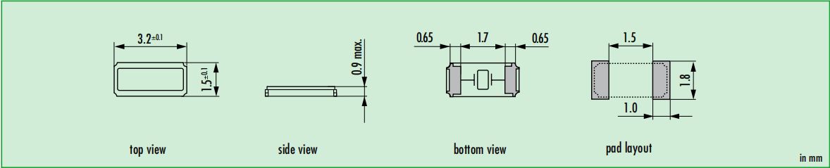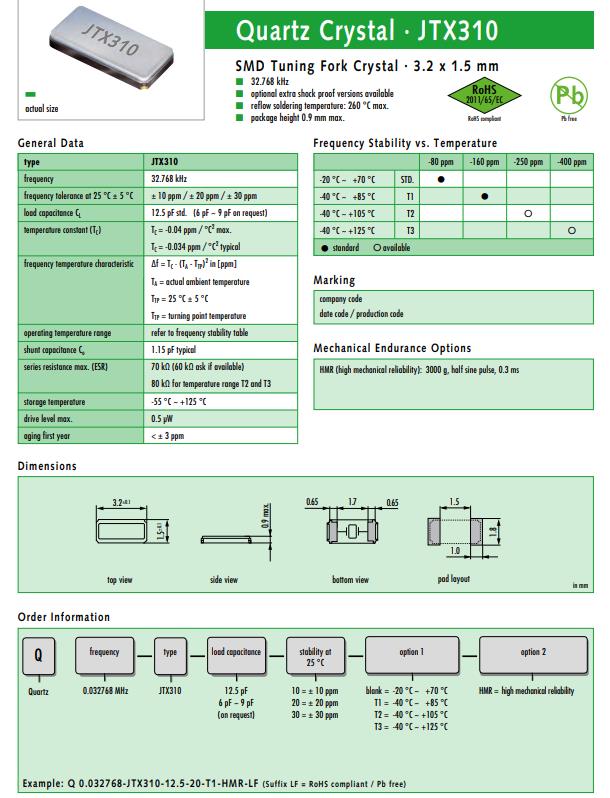 JTX310|Q 0.032768-JTX310-7-20-T2-HMR-LF|32.768KHz|-40~125℃|7PF|20PPM|3215|,歐美進(jìn)口晶振,32.768 kHz,可選的額外防震版本,回流焊溫度:最大260°C。n個(gè)包裝高度,最大0.9 mm。SMD調(diào)諧音叉晶體·3.2 x 1.5毫米