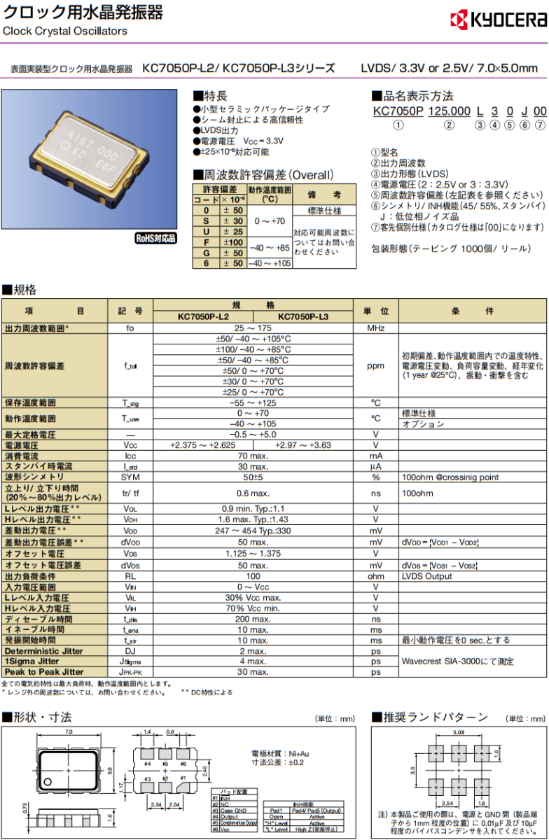 | KC7050P125.000L30E00 | KYOCERA晶振 | KC7050P-L3 | XO (Standard) | 125 MHz | LVDS | 3.3V |