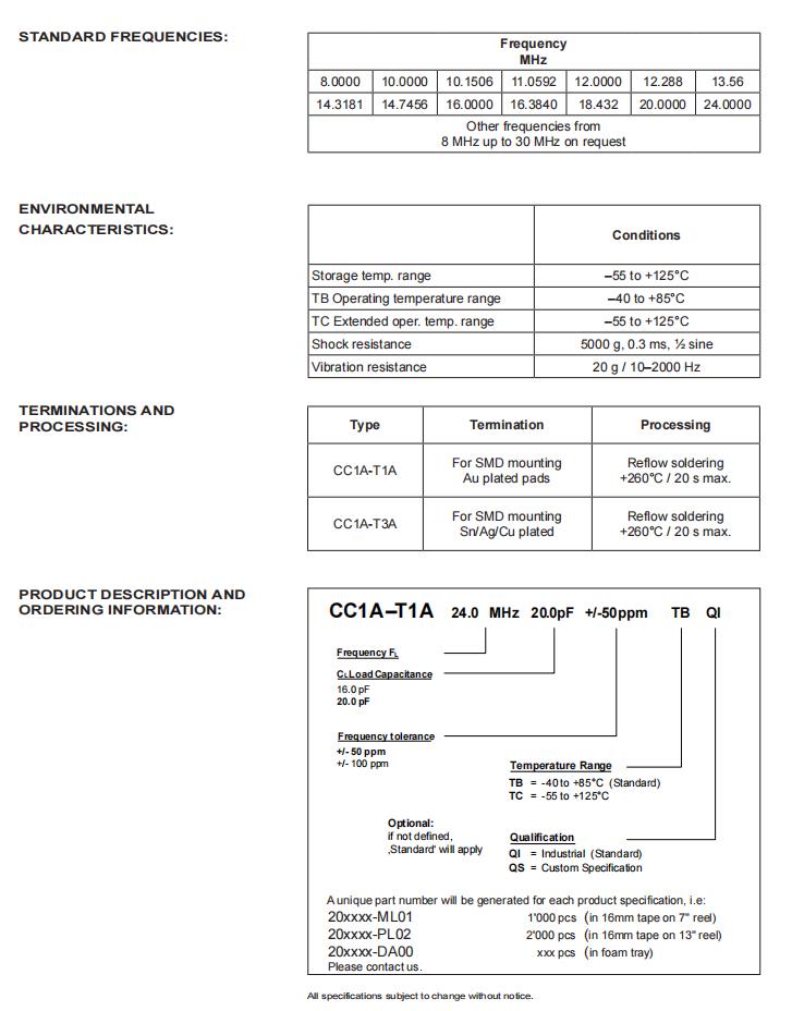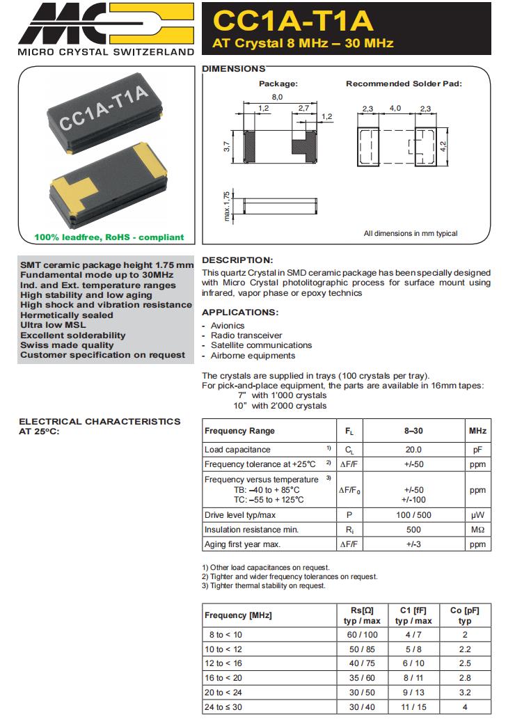Micro進口晶振|CC1A-T1A-18.000MHz-20.0pF-100ppm-TA-QI|6G無線通信晶振規(guī)格表