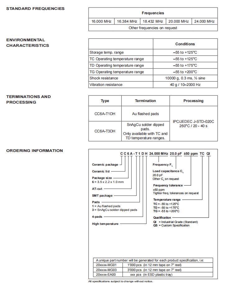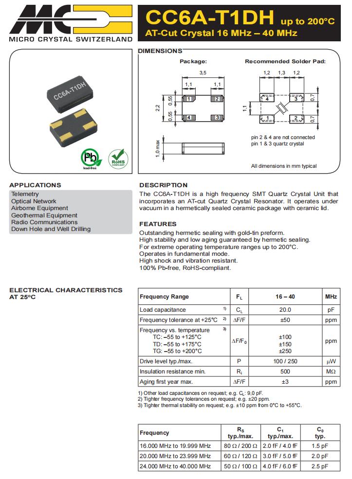 CC6A-T1DH-24.000MHz-20.0pF-50ppm-TC-QI|6G無線電通信晶振|耐高溫晶振,Micro晶振,CC6A-T1DH是一種高頻SMT石英晶體單元,CC6A-T1DH-24.000MHz-20.0pF-50ppm-TC-QI晶振,適用于高達(dá)200°C的極端工作溫度范圍,頻率24MHz,負(fù)載20pf,頻率穩(wěn)定性100ppm,工作溫度-55~125°C,耐高溫晶振,高穩(wěn)定性晶振,6G無線電通信晶振,遙感勘測(cè)晶振,地?zé)嵩O(shè)備應(yīng)用晶振,井下和鉆井設(shè)備應(yīng)用晶振.
