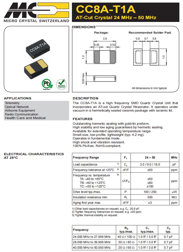 CC8A-T1A-25.000MHz-9.0pF-50ppm-TA-QI,6G基站晶振,高頻貼片石英晶體,Micro晶振,CC8A-T1A無源晶振,CC8A-T1A-25.000MHz-9.0pF-50ppm-TA-QI晶振,高頻貼片石英晶振,2012mm超小型晶振,頻率25MHz,負(fù)載9pf,頻率穩(wěn)定性50ppm,工作溫度-40~85°C,耐高溫晶振,高穩(wěn)定性晶振,6G基站晶振,遙感勘測晶振,光學(xué)網(wǎng)絡(luò)晶振,機(jī)載設(shè)備晶振.
