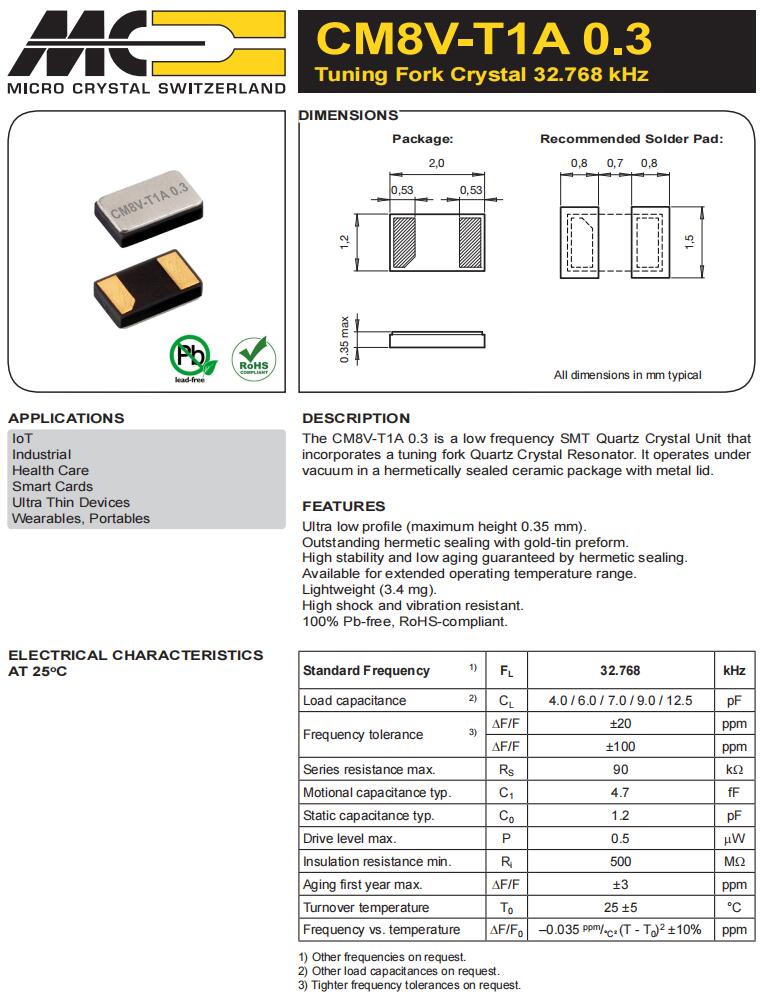 | CM7V-T1A-32.768kHz-12.5pF-100PPM-TA-QC | Micro Crystal | 晶體 32.768 kHz 12.5 pF +/-100 PPM -40/+85C |