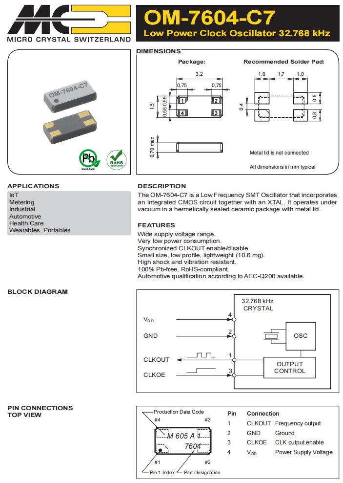 | OM-7604-C7-32.768kHz-20PPM-TB-QC | Micro Crystal | 標準時鐘振蕩器 32.768 kHz +/-20 PPM -40/+125C |