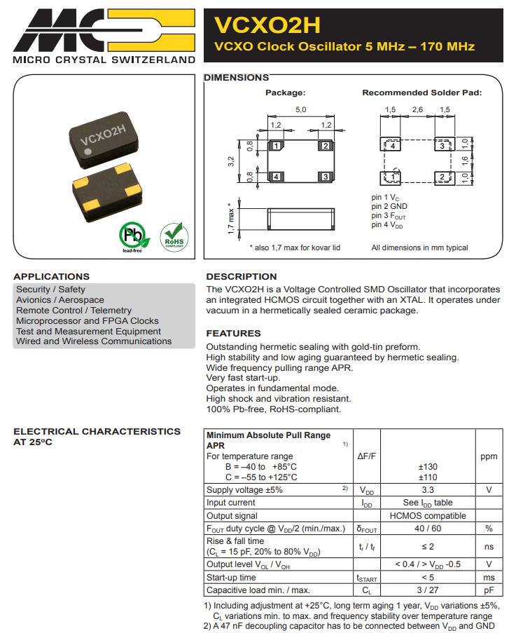 VCX02HV-B-100.000MHz-T3,VCXO晶振,6G無線通信晶振,瑞士微晶晶振,VCX02H有源晶振,VCX02HV-B-100.000MHz-T3晶振,VCXO晶振,5032mm晶振,頻率100MHz,電壓3.3V,頻率穩(wěn)定性130ppm,工作溫度-40~85°C,無鉛環(huán)保晶振,高品質(zhì)晶振,6G無線通信晶振,安全設(shè)備晶振,有線通信晶振,航空航天晶振.