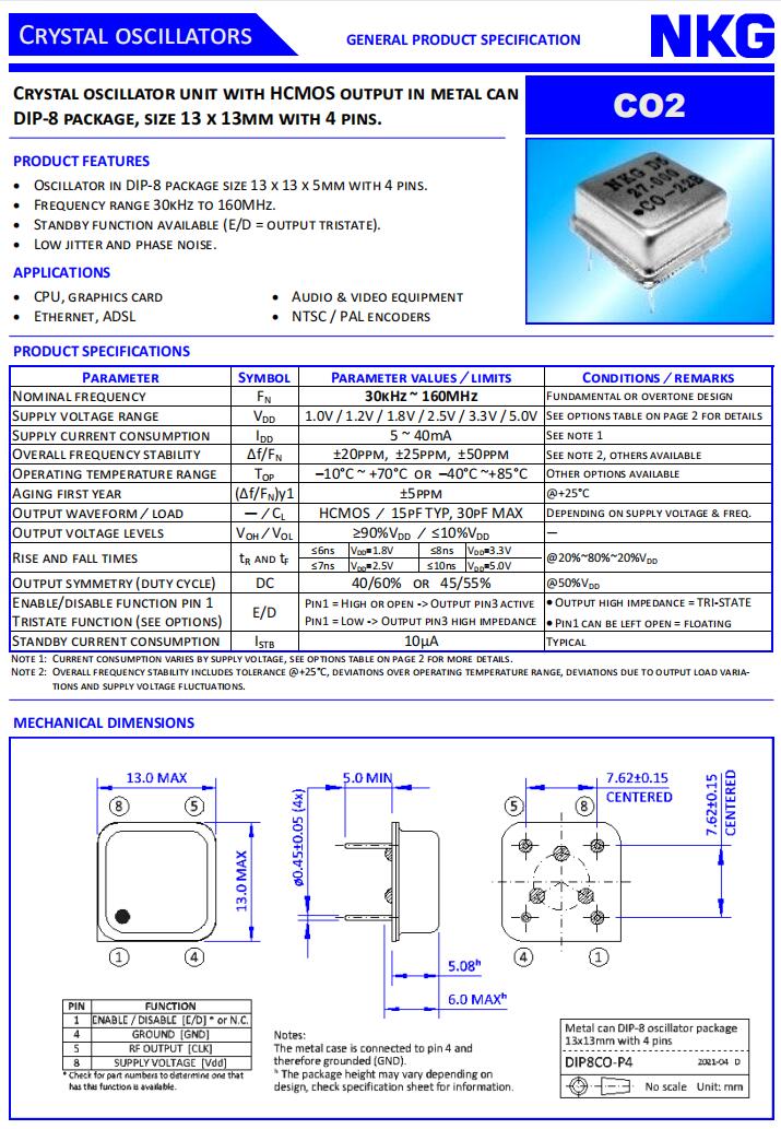 NKG Crystal|CO2-5-B-10.2400-WNS-EXT|正方形鐘振,NKG晶振,CO2正方形鐘振,進(jìn)口有源晶振,CO2-5-B-10.2400-WNS-EXT晶振,石英振蕩器,四腳插件晶振,13 x 13 x 5mm四腳插件封裝,支持待機(jī)功能,頻率10.24MHz,電壓3.3V,負(fù)載15pF,工作溫度-40~85°C,頻率穩(wěn)定性50ppm,低抖動晶振,高品質(zhì)晶振,抗震動晶振,專業(yè)視頻設(shè)備晶振,以太網(wǎng)晶振,CPU顯卡晶振,PAL編碼器晶振.