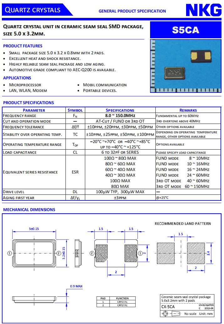 NKG晶振|S5CA32.000F16E23-EXT|便攜式設(shè)備晶振規(guī)格表
