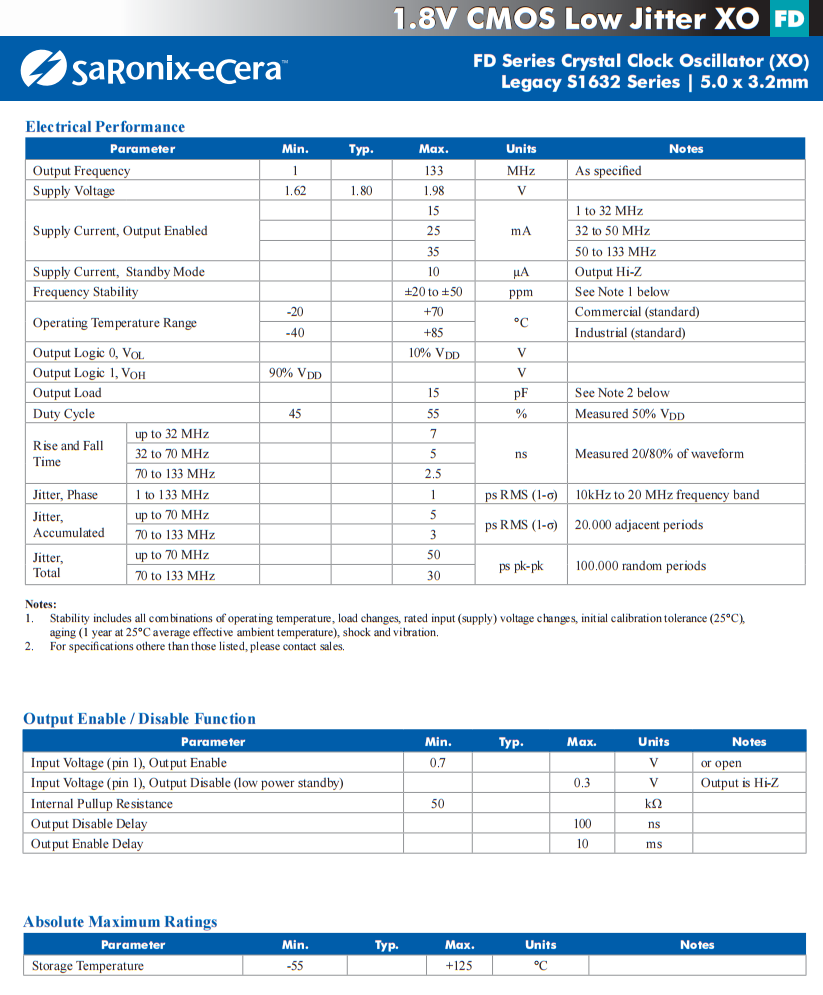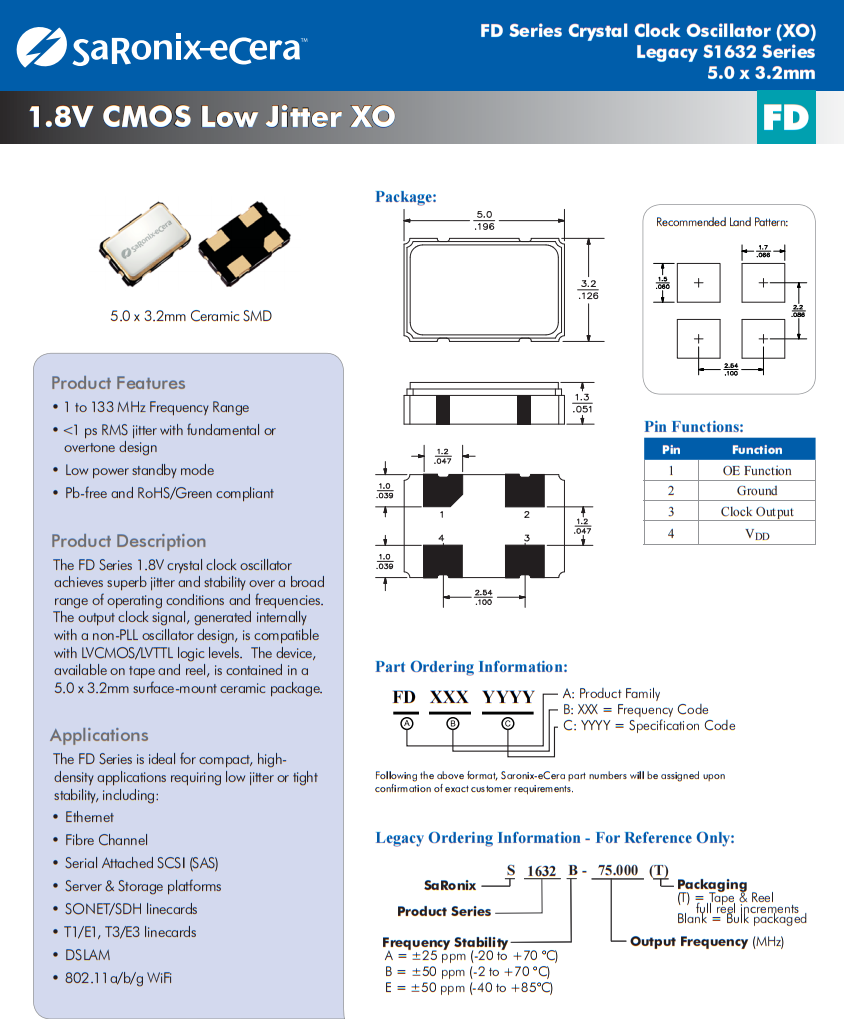 | FD0500003 | Diodes晶振 | FD | XO | 5MHz | CMOS | 3.3V | ±50ppm |