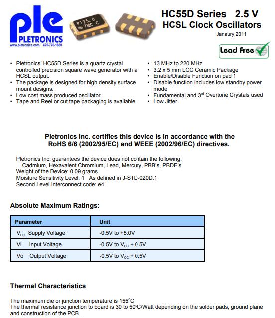 更多>>Pletronics晶振,HC55D晶振,HCSL輸出晶振