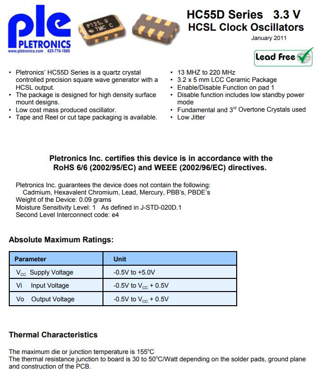 更多>>Pletronics晶振,HC55D晶振,HCSL3.3V晶振