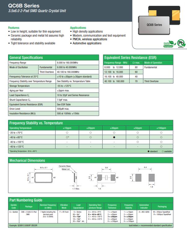 2、選擇型號。選用的貼片晶振看清外殼的型號標記,型號表明了晶振的多項參數(shù)性能,如果晶振型號選擇不當,將導(dǎo)致產(chǎn)品應(yīng)用不匹配,不能正常工作。QANTEK石英晶體,QC6B晶振,6035二腳晶振