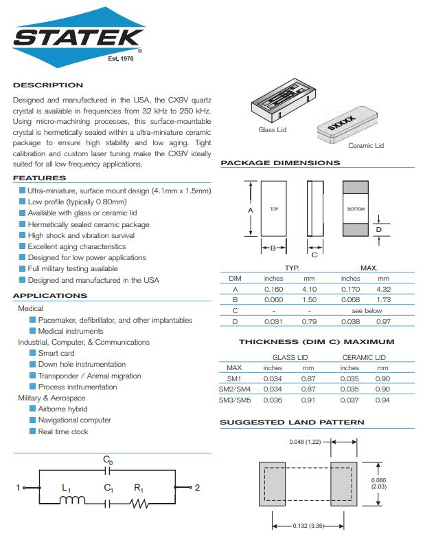 STATEK晶振將水晶放置玻璃封裝以及陶瓷蓋封裝內(nèi),人造水晶相較于其他使用機(jī)械生產(chǎn)的水晶要小的多.所生產(chǎn)水晶元件具有領(lǐng)先優(yōu)勢(shì),具有以下特點(diǎn):高穩(wěn)定性,頻率精準(zhǔn),保存溫度范圍廣,抗老化性能強(qiáng)等特點(diǎn).Statek石英晶振,晶體振蕩器具有小型化,低功耗,優(yōu)秀的耐沖擊性,抗氧化性佳等特點(diǎn).廣泛使用于全球GPS定位系統(tǒng),WLAN網(wǎng)絡(luò)產(chǎn)品,網(wǎng)絡(luò)控制器,無線基站,程控交換設(shè)備,精密儀器,GPS衛(wèi)星,汽車應(yīng)用,計(jì)算機(jī),全球GPS定位系統(tǒng),無線通訊,數(shù)碼產(chǎn)品等等.