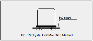 (3)安裝引線型晶振晶體單元時(shí),我們建議設(shè)備應(yīng)與PC聯(lián)系電路板和焊接方式,以防止疲勞和由于機(jī)械共振引起的引線斷裂(見(jiàn)圖。13)。