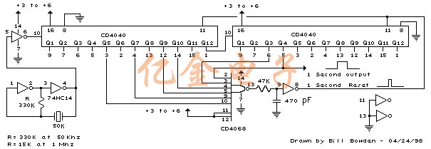 下面的示意圖說(shuō)明了將石英晶體振蕩器信號(hào)除以晶體頻率,以獲得精確的(0.01%)1秒時(shí)基.兩個(gè)級(jí)聯(lián)的12級(jí)計(jì)數(shù)器(CD4040)形成24級(jí)二進(jìn)制計(jì)數(shù)器,并且將適當(dāng)?shù)奈婚T(mén)控在一起以產(chǎn)生所需的除法.使用一些偶數(shù)倍的2的石英晶體是理想的,這樣計(jì)數(shù)器的一級(jí)自動(dòng)切換每秒,這消除了對(duì)NAND門(mén)和復(fù)位電路的需要,但是下面的電路說(shuō)明使用的晶體不是2的偶數(shù)倍.所以需要額外的組件.