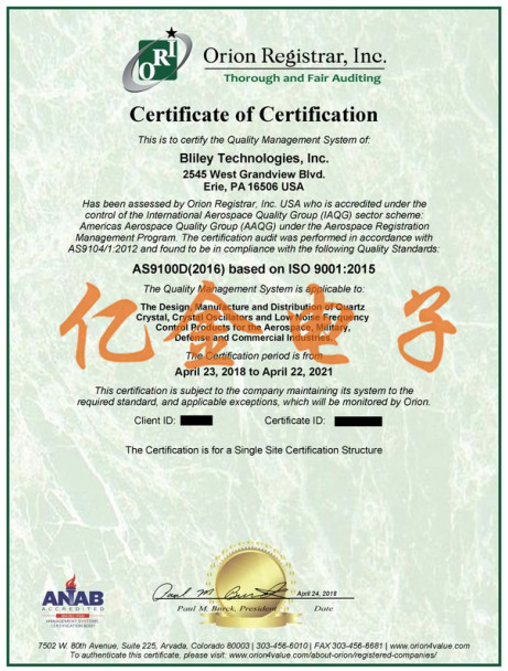 Bliley晶振的Erie工廠于2018年2月獲得認(rèn)證,展示了完全記錄并實(shí)施的質(zhì)量管理體系,該體系已通過AS9100:2016標(biāo)準(zhǔn)認(rèn)證.