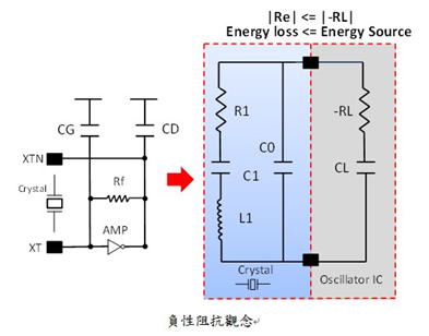 石英晶體共振子的兩端往振蕩電路看過去,排除共振子以外的所有阻抗特性質(zhì)總和,振蕩電路上必須提供足夠大的增益來補(bǔ)償共振子共振時(shí)的機(jī)械能損耗,也就是放大器為一個(gè)能量源,若負(fù)性阻抗的能量源大于振蕩電路的損耗時(shí),能源回路為平衡狀態(tài)此回路為穩(wěn)定振蕩,負(fù)性阻抗不是產(chǎn)品規(guī)格參數(shù),但卻是振蕩線路設(shè)計(jì)時(shí)很重要的性能指針.