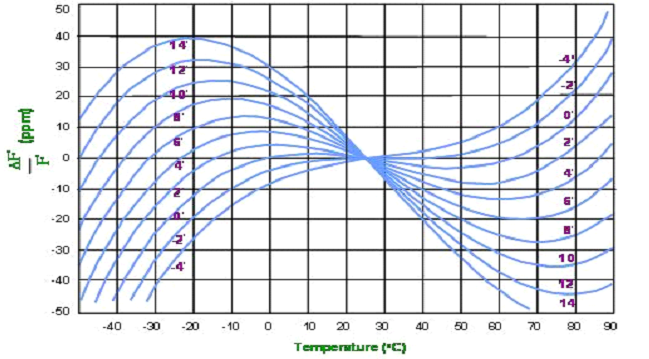 以AT切割角度變動在厚度振動模態(tài)的頻率對溫度特性的展開圖. 圖中以常用的室溫攝式25度作為相對零點, AT切割的最大優(yōu)點是頻率對溫度變化為一元三次方曲線. 這個特性, 從(圖六)中可以看到, 在相當寬廣的溫度范圍下, AT切割的溫度曲線的第一階及第二階常數(shù)為零, 第三階的常數(shù)便決定了頻率對溫度的變化值.