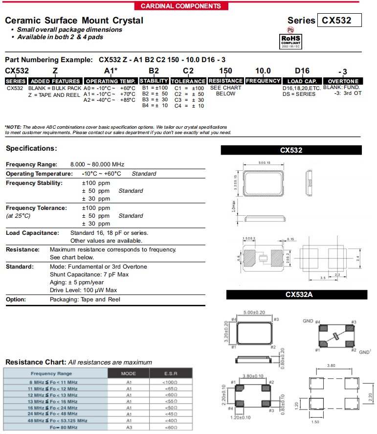 美國(guó)進(jìn)口晶振,Cardinal卡迪納爾晶振CX532,是一款小體積晶振尺寸5.0x3.2mm表面貼裝晶體,整體封裝尺寸小,CX532晶振兩腳貼片晶振 和CX532A晶振四腳貼片晶振可供選擇,無(wú)源晶振,石英晶振,貼片晶振,石英晶體諧振器,頻率范圍:8MHz-80MHz,頻率穩(wěn)定度:±30ppm,工作溫度范圍:-40℃至+85℃,無(wú)鉛環(huán)保晶振,該石英晶體諧振器具有超小型,輕薄型,耐熱及耐環(huán)境特點(diǎn),被廣泛用于通訊設(shè)備,無(wú)線(xiàn)局域網(wǎng),藍(lán)牙模塊晶振,汽車(chē)電子,醫(yī)療設(shè)備,數(shù)碼電子,平板電腦,物聯(lián)網(wǎng)應(yīng)用等。無(wú)線(xiàn)局域網(wǎng)應(yīng)用晶振CX532Z-A5B3C5-70-20.0D18