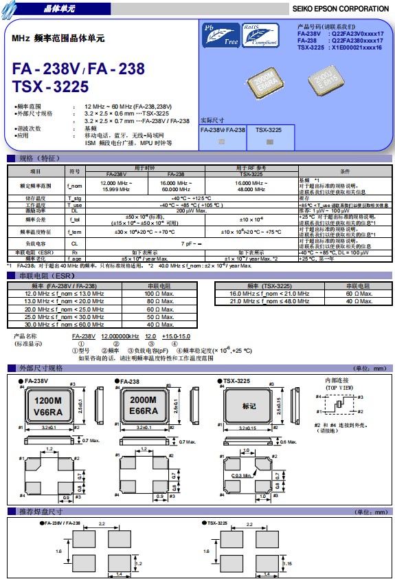 日本進(jìn)口愛(ài)普生晶振FA-238V是一款小體積晶振尺寸3.2x2.5mm四腳貼片晶振,無(wú)源晶振,石英晶體諧振器,F(xiàn)A-238V頻率范圍12MHz至15.9999MHz之間,可以在-40℃至+85℃(+105℃)溫度內(nèi)穩(wěn)定工作,該產(chǎn)品具有小體積輕薄型,耐熱、耐振、耐沖擊等優(yōu)良的耐環(huán)境特性,被廣泛用于移動(dòng)通訊,智能手機(jī),平板電腦,汽車電子,移動(dòng)電話,無(wú)線藍(lán)牙,ISM頻段電臺(tái)廣播,MPU時(shí)鐘等.