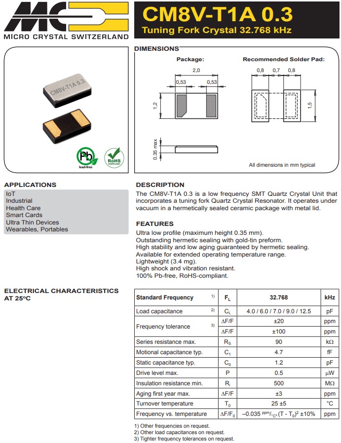 | Micro Crystal | CM8V-T1A-32.768kHz-12.5pF-20PPM-TA-QC | 32.768 kHz 12.5 pF +/-20 PPM -40/+85C | 32.768 kHz |